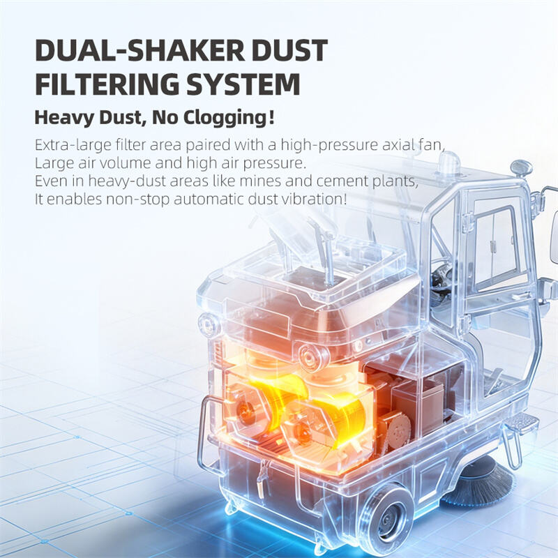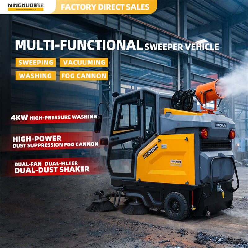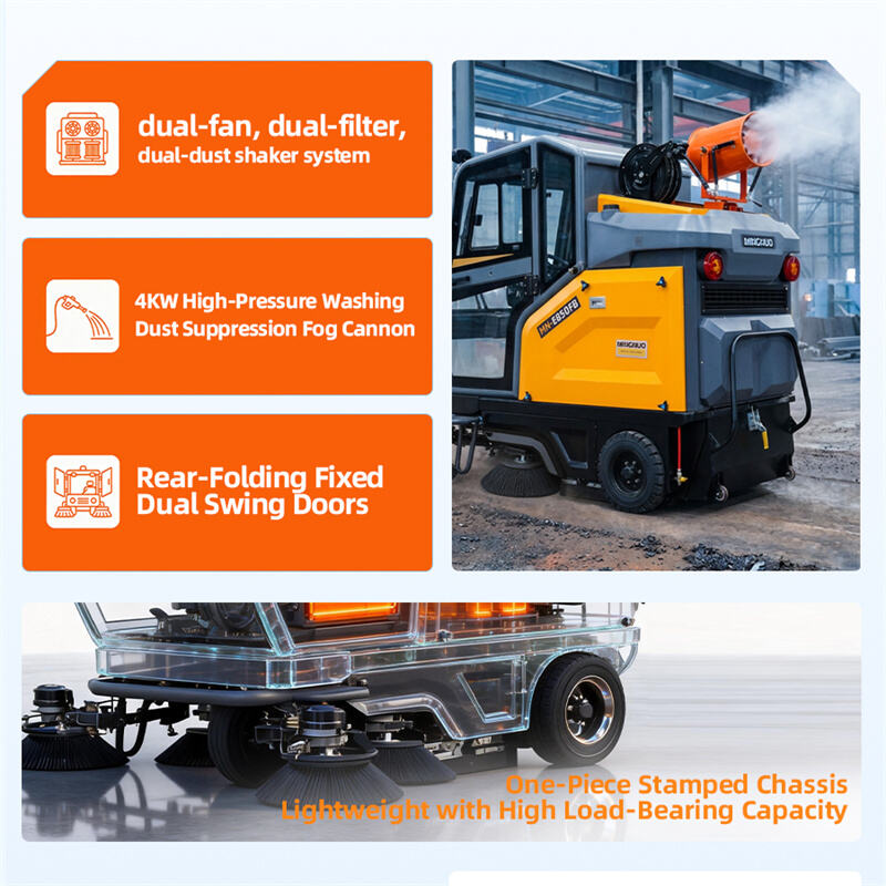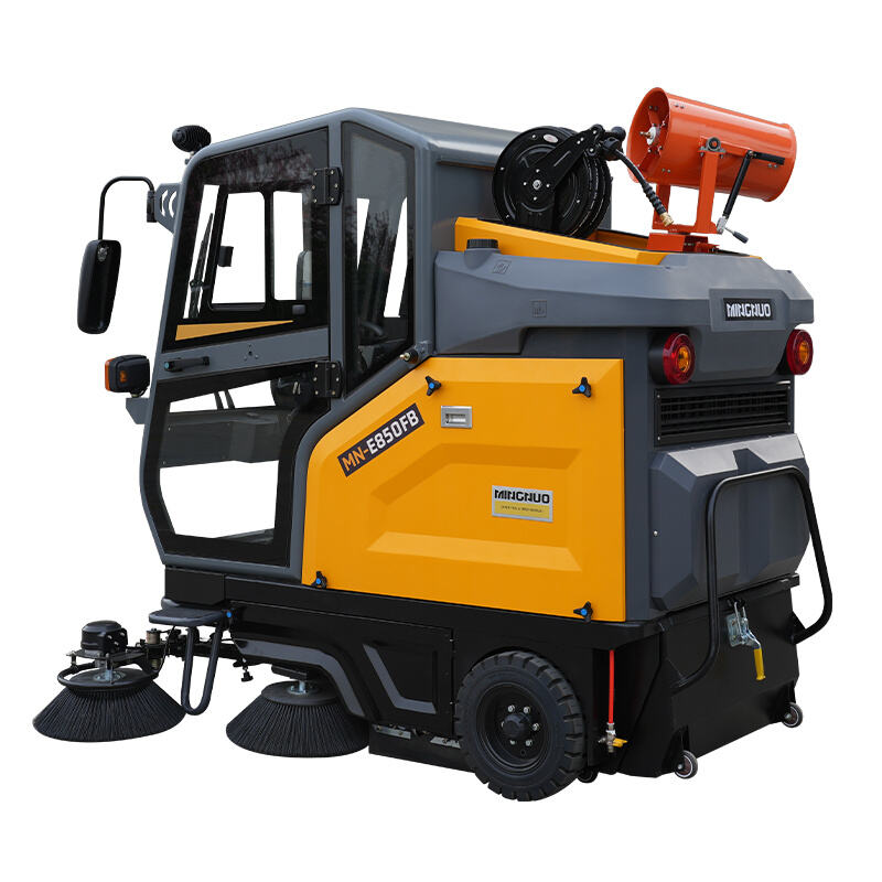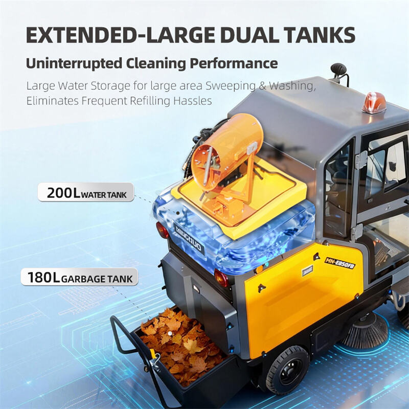 Die MN-E850FB is ’n hoogvermoë elektriese geslote veegmasjien met ’n dubbele ventilator, dubbele-filter en dubbele-skudstofiltersisteem. Dit het ’n groot filteroppervlakte en bewerkstellig outomatiese filterskudding sonder om tydens bedryf te stop, wat uitstekende skoonmaakprestasie en hoë doeltreffendheid verseker. Dit word standaard verskaf met ’n 48 V, 200 Ah ultra-groot kapasiteit litiumbattery vir ’n lang werksduur. Dit is toegerus met ’n 4 kW hoëdrukspoel- en miskanon wat afvalhouers kan spoel, klein advertensies kan verwyder en stofonderdrukking kan uitvoer. Die groot waterspan kan aan die behoeftes van langdurige spuit- en wasbewerkings voldoen, wat dit geskik maak vir verskeie skoonmaaktake.