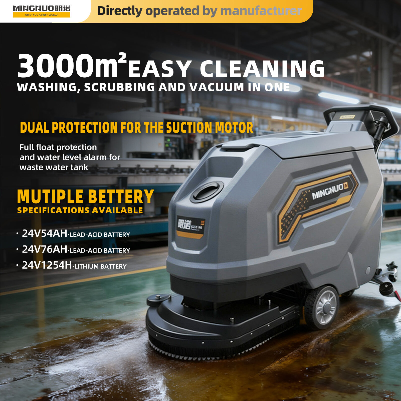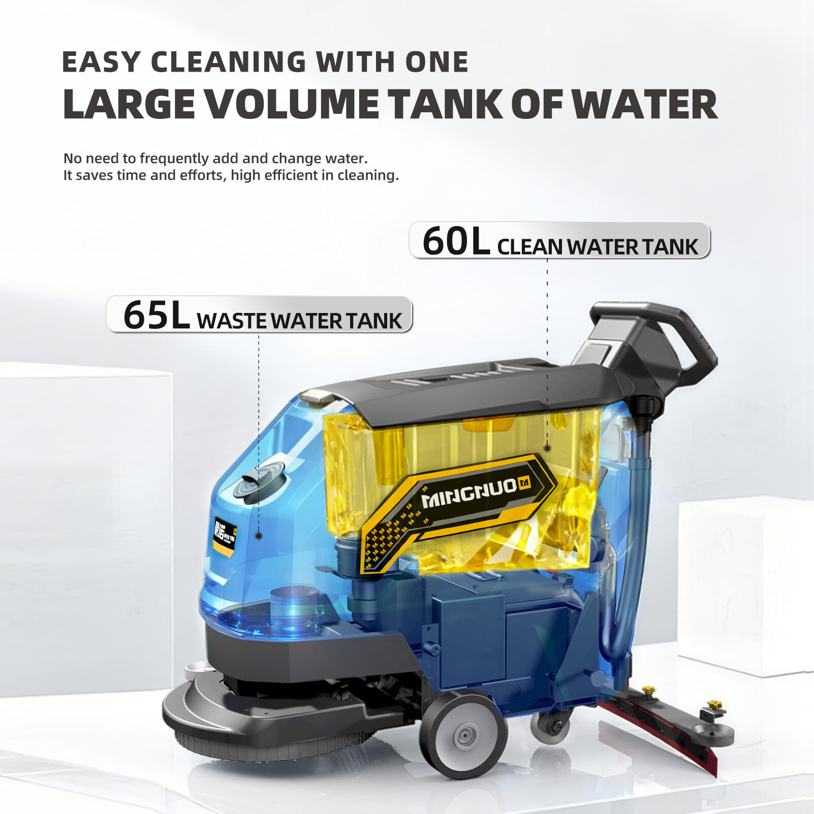 Máy chà sàn đi bộ MN-V52 được thiết kế chủ yếu để làm sạch các loại mặt sàn khác nhau, bao gồm gạch, đá cẩm thạch, sàn epoxy và nhiều loại khác. Máy cũng có khả năng làm sạch hiệu quả các bề mặt sàn dính dầu nhờ vào việc sử dụng thêm chất tẩy rửa phù hợp. Được trang bị bình chứa nước sạch 60L và bình chứa nước thải 65L, máy chà sàn này mang lại độ bền và sự tin cậy cao. Hiệu suất năng lượng cao cùng áp lực làm sạch mạnh mẽ khiến nó lý tưởng để làm sạch nhanh chóng các không gian thương mại lớn. Thường được sử dụng trong các cửa hàng bán lẻ, nhà máy sản xuất, kho bãi, trung tâm mua sắm, trung tâm hội nghị, nhà ga sân bay, khu đỗ xe, nhà ga xe lửa và các khu vực có lưu lượng người qua lại lớn khác, thiết bị này mang lại hiệu suất làm sạch vượt trội trong nhiều môi trường đa dạng.